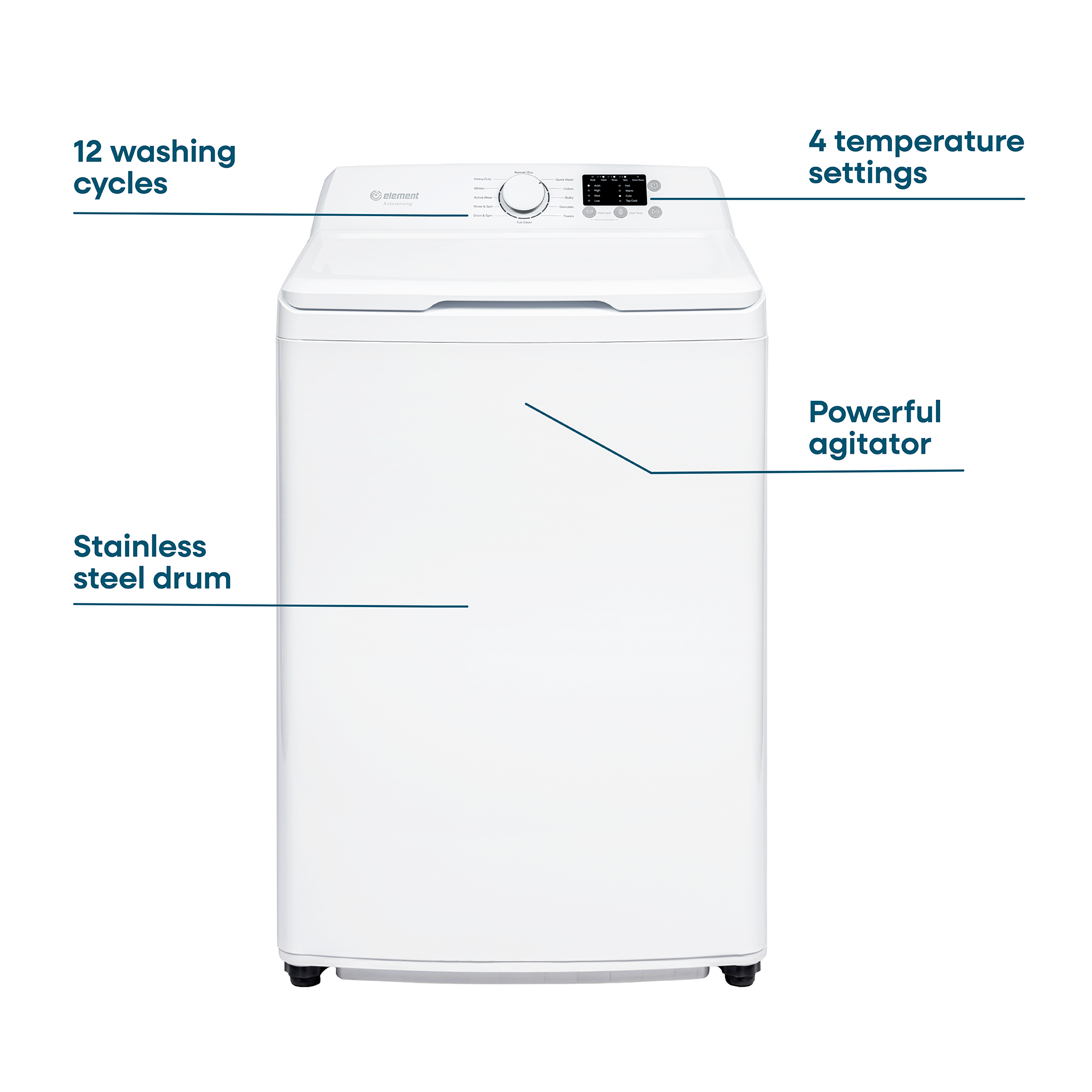 Efficient, spacious, and dependable, Element’s 3.9 cu. ft. top load washer boasts all the features you need for a top-notch clean. Choose from 12 different wash cycles to match your fabrics from delicate to bulky. Pair the perfect temperature and care for your clothing by selecting from four wash temperatures. The agitator provides a hard hitting clean that’s gentle on fabrics. The stainless steel drum is spacious and durable for continued use. Plus, Element’s washers are HE detergent compatible, making your wash cycles more efficient while using less water. Go ahead — take it for a spin.