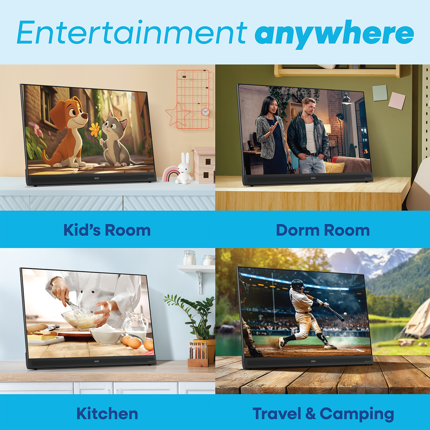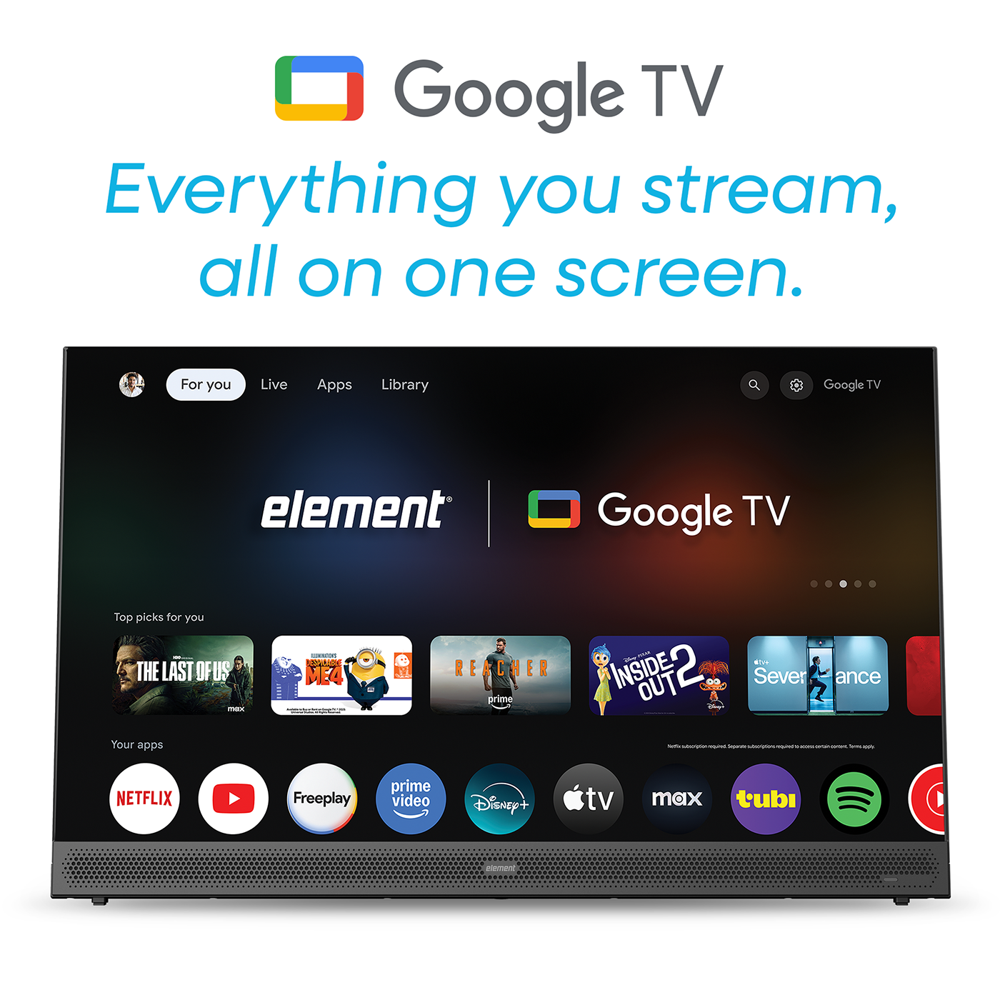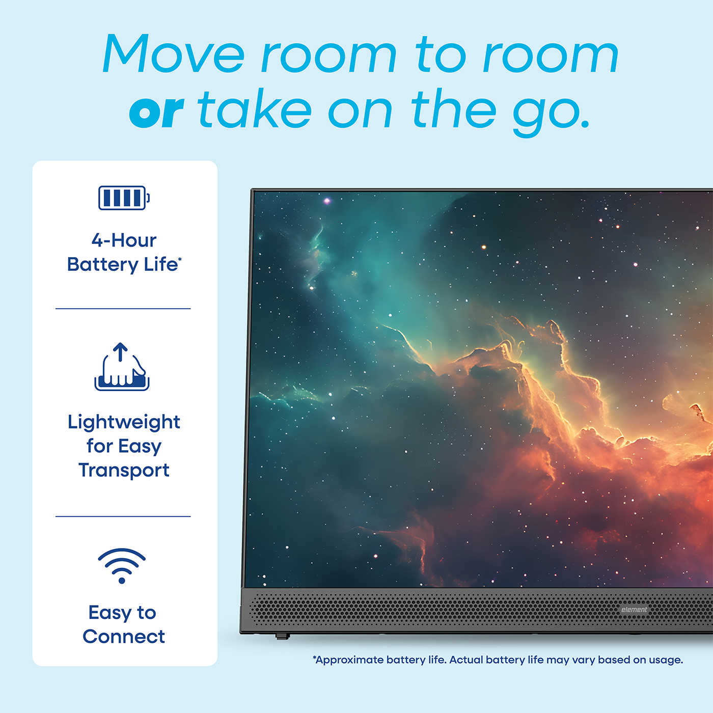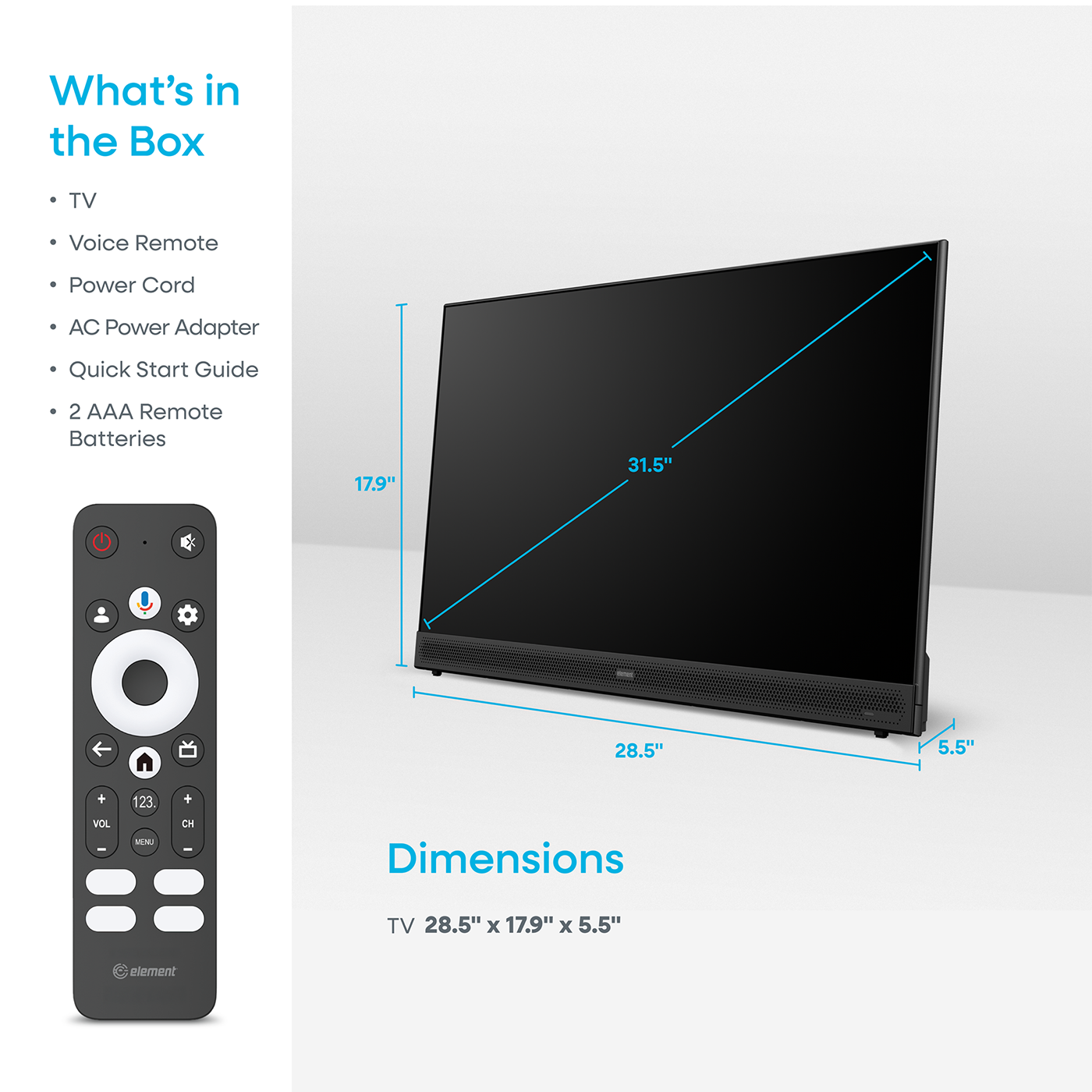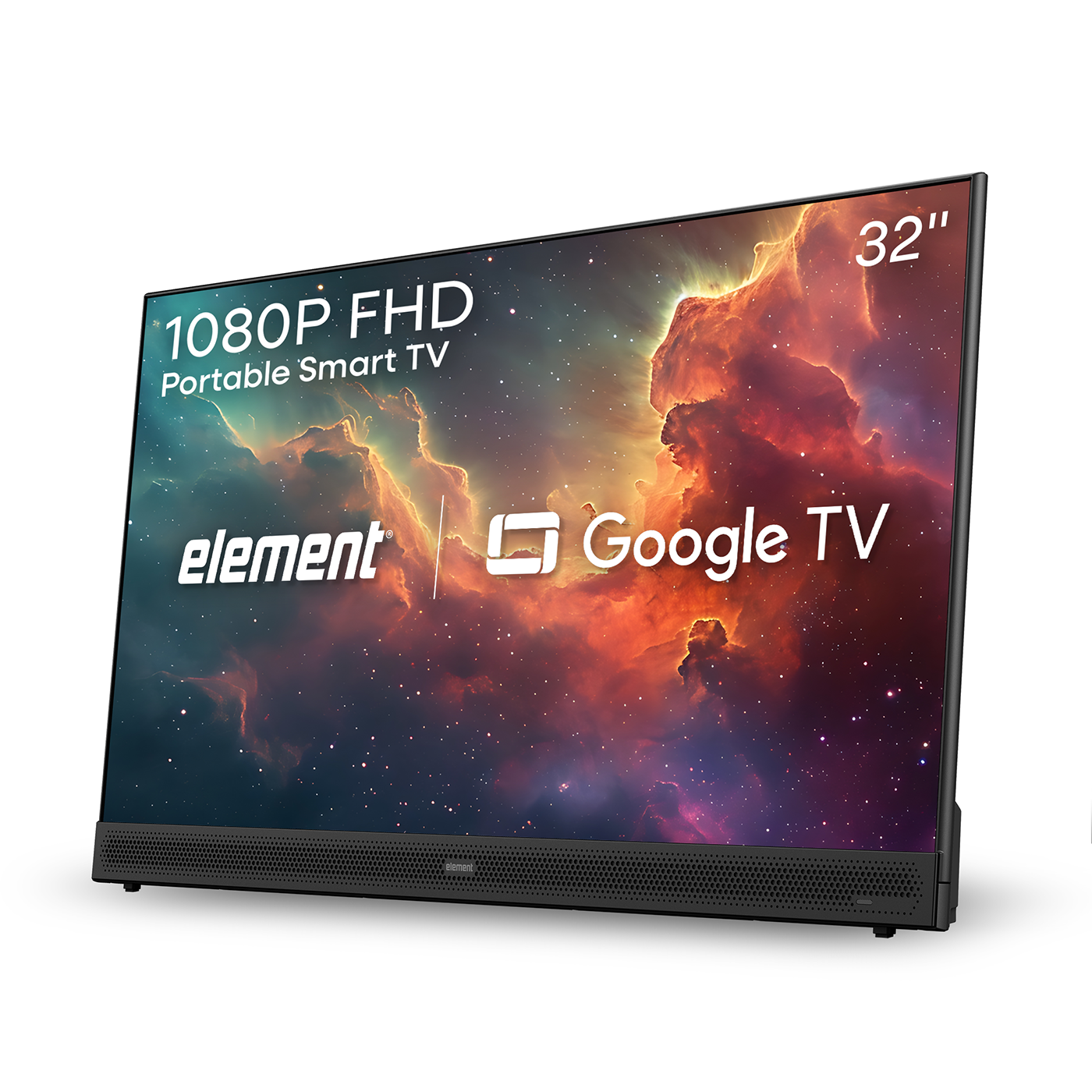 Enjoy entertainment anywhere with Element’s 32-inch 1080p FHD Smart Google TV. Compact and lightweight, this TV is designed to move with you—whether that’s room to room in your home, your dorm, RV or even on the go. With an approximate battery life of up to 4 hours, a lightweight design with handle to carry and Wi-Fi connectivity, it’s easy to watch what you want, where you want. The 1080-pixel full high-definition resolution provides vibrant colors and sharp contrasts on a crystal-clear screen, while Dolby Audio delivers rich, clear sound to enhance your viewing experience.
