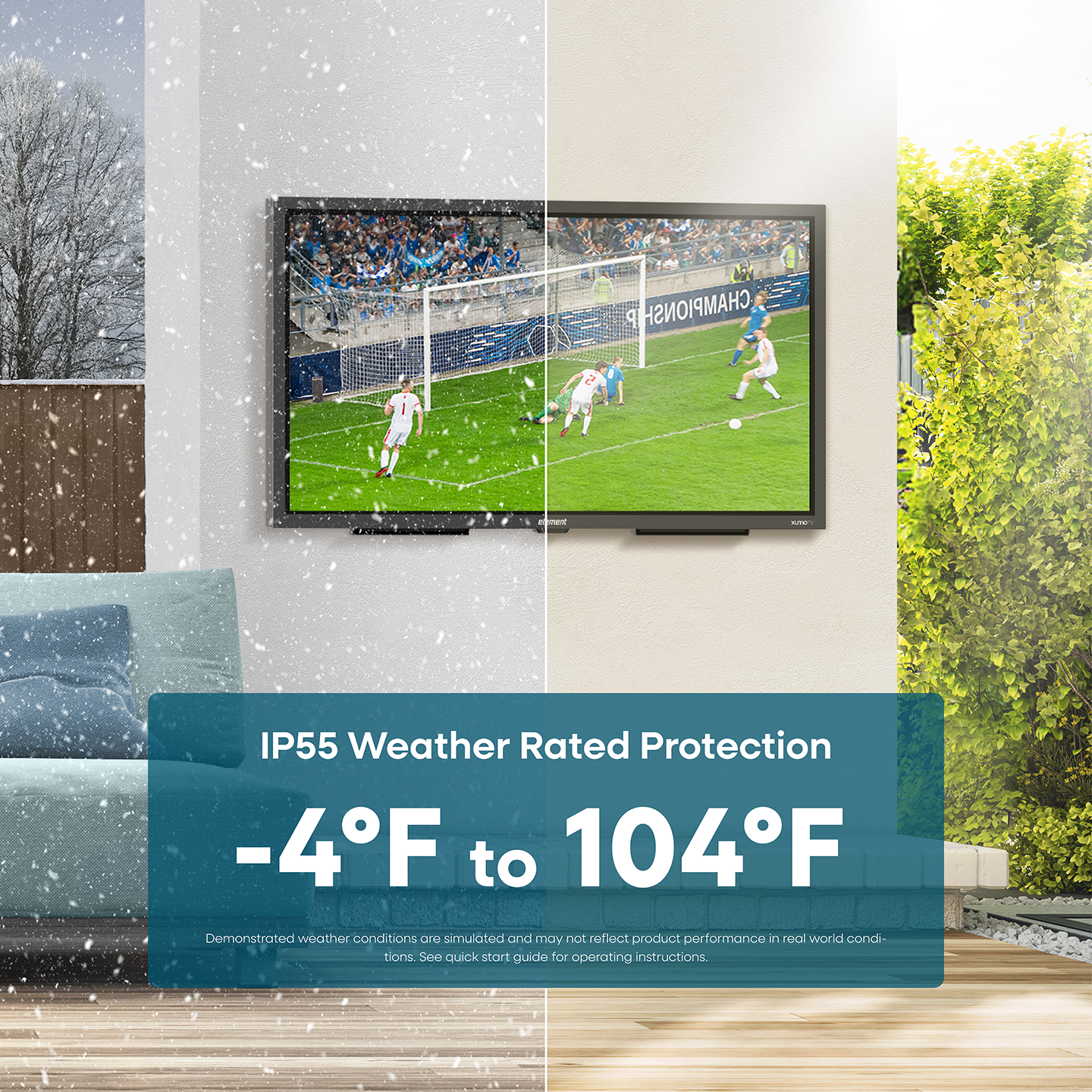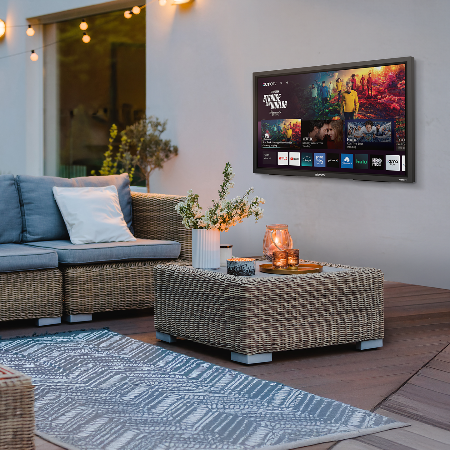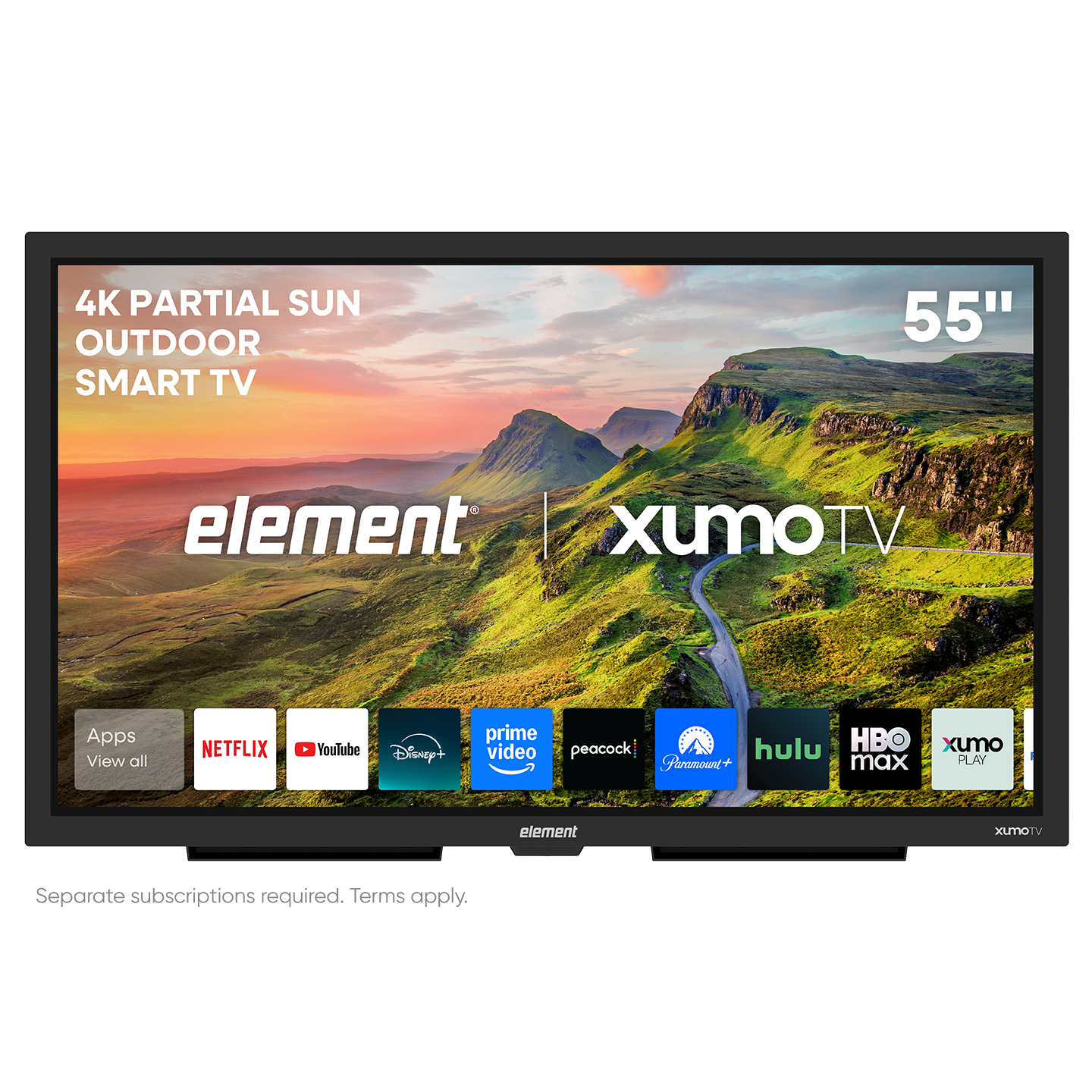 Bring your viewing experience outdoors with Element’s 55-inch 4K UHD Partial Sun Outdoor Smart Xumo TV. This 4K TV with HDR10 provides a premium viewing experience that’s the perfect addition to any outdoor space. With IP55 weather rated protection against water, dust, dirt and humidity, anti-glare 700 nit screen, and tempered glass, you can stream all your favorite TV shows, movies and more from outdoors while keeping your TV protected from whatever the weather brings. Xumo TV is a smart TV experience that makes it easy to find the content you really want to watch. Over 250 top apps come together on one simple platform that makes streaming easy without all the app hopping. Discover new content or launch your favorites from your personalized home screen, curate a watchlist with My List and search across all apps at once using your voice. And with Bluetooth® built in, you can easily pair your television with compatible Bluetooth devices, such as speakers, headphones, game controllers, laptops, and more. Host a movie night or watch the game with the Element 55-inch smart Xumo TV designed for the outdoors.