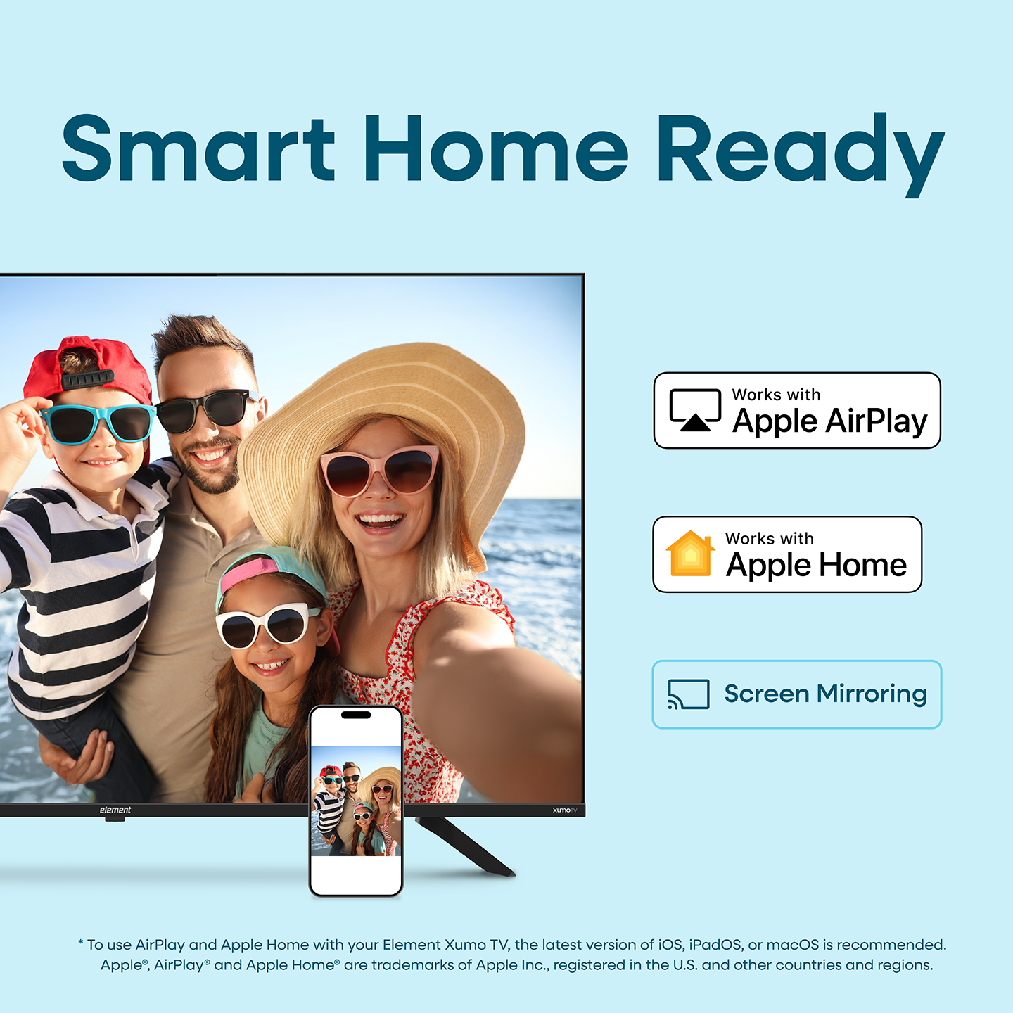 Seamless Entertainment and Smart Living: Step into the future of home entertainment with the Xumo Element TV, seamlessly integrating Apple Home™ and Apple AirPlay® capabilities. Harness the power of Apple Home for a unified smart home experience, making it easier to control all your smart home accessories — on all your Apple devices. Plus, with AirPlay, effortlessly stream movies, music, games, and photos from your iPhone, iPad, or Mac directly to your TV. Elevate your viewing with the perfect fusion of innovation and convenience.