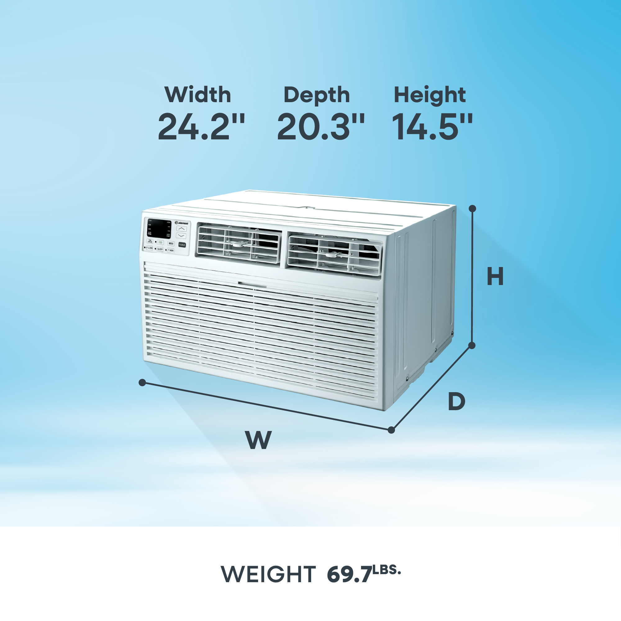 Take back your floor space and enjoy permanent cooling comfort. The Element 12,000 BTU Through-the-Wall Air Conditioner cools up to 550 square feet with powerful, reliable performance and installs directly into your existing wall sleeve. Installation is straightforward with a universal fit design that works with standard wall sleeves, and the trim kit is included. Remote control operation lets you manage temperature and fan speed from anywhere in the room, while Sleep Mode automatically adjusts settings for restful nights. The built-in dehumidifier removes excess moisture, and the washable filter simplifies maintenance. With electronic controls, a programmable 24-hour timer, and energy-saving Eco Mode, the Element 12,000 BTU Through-the-Wall Air Conditioner delivers the permanent cooling solution your home deserves.