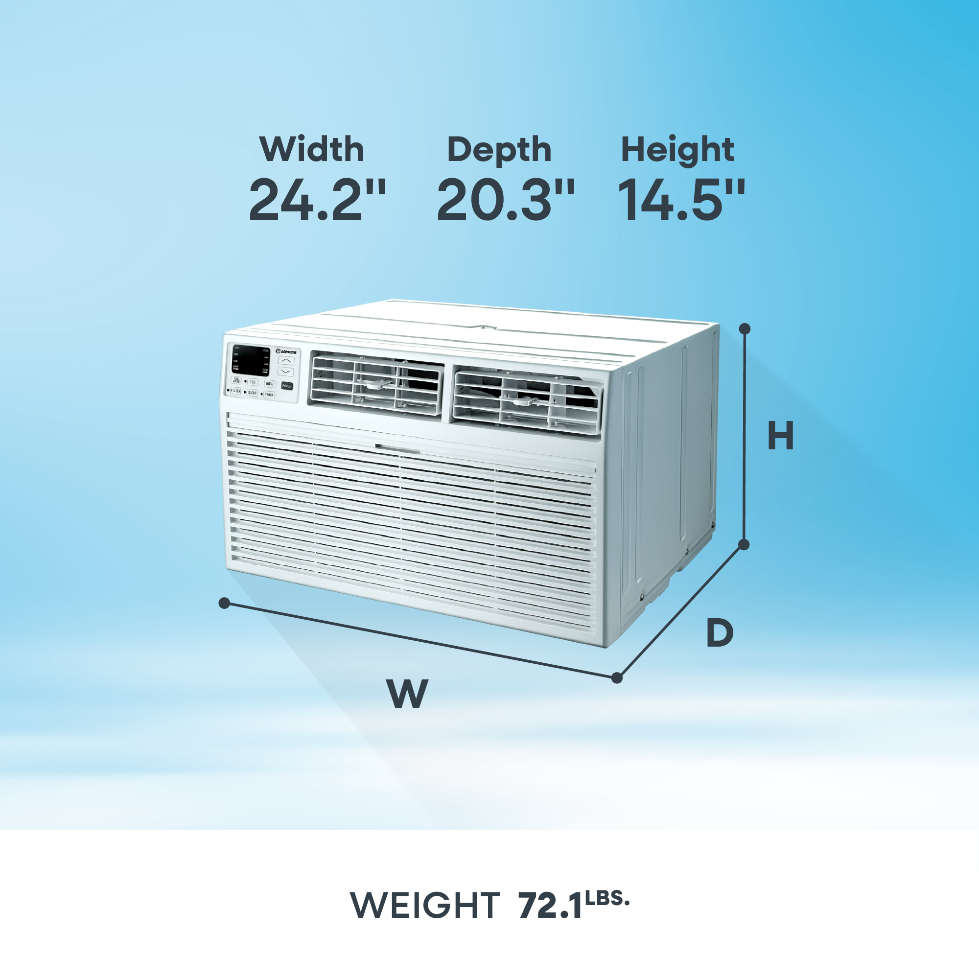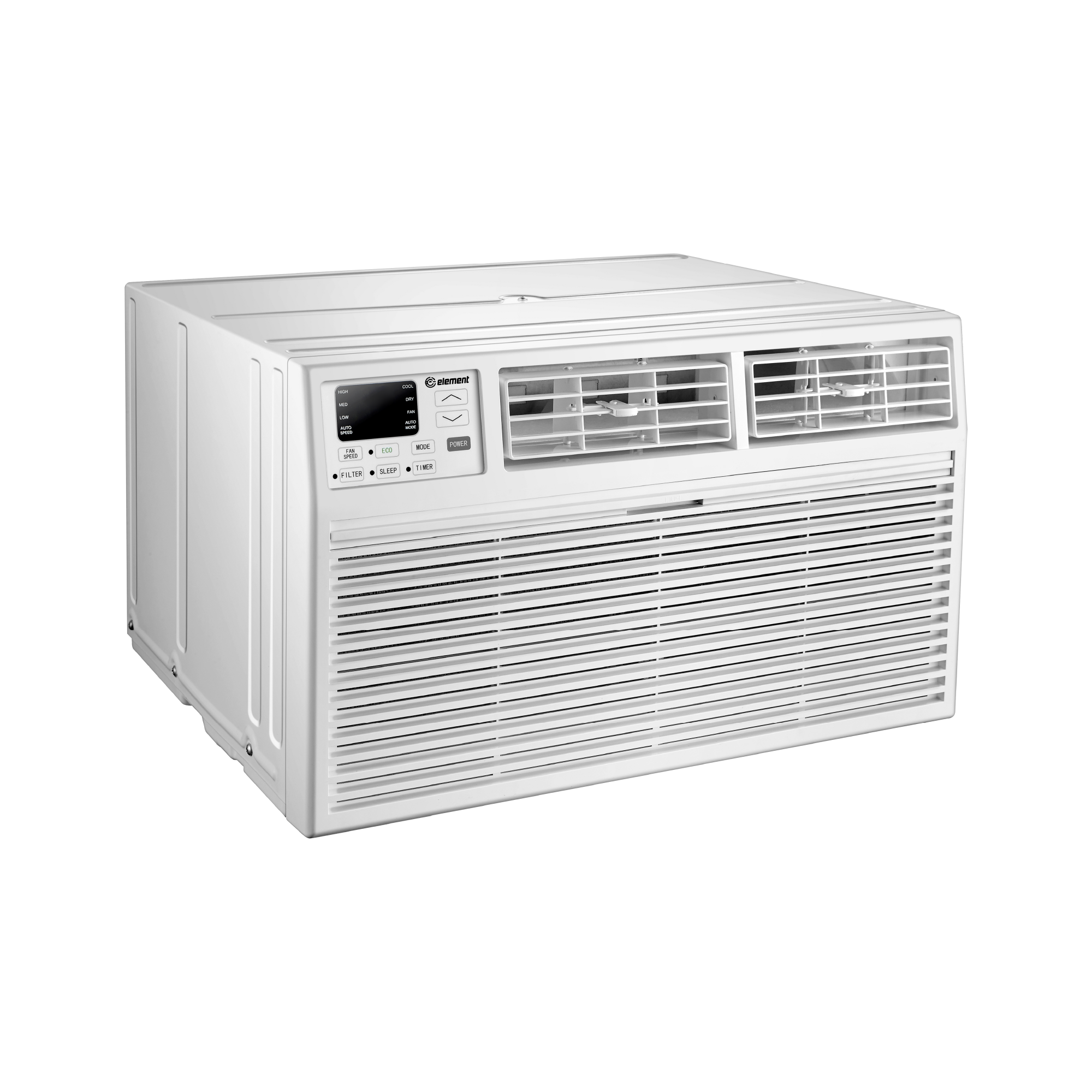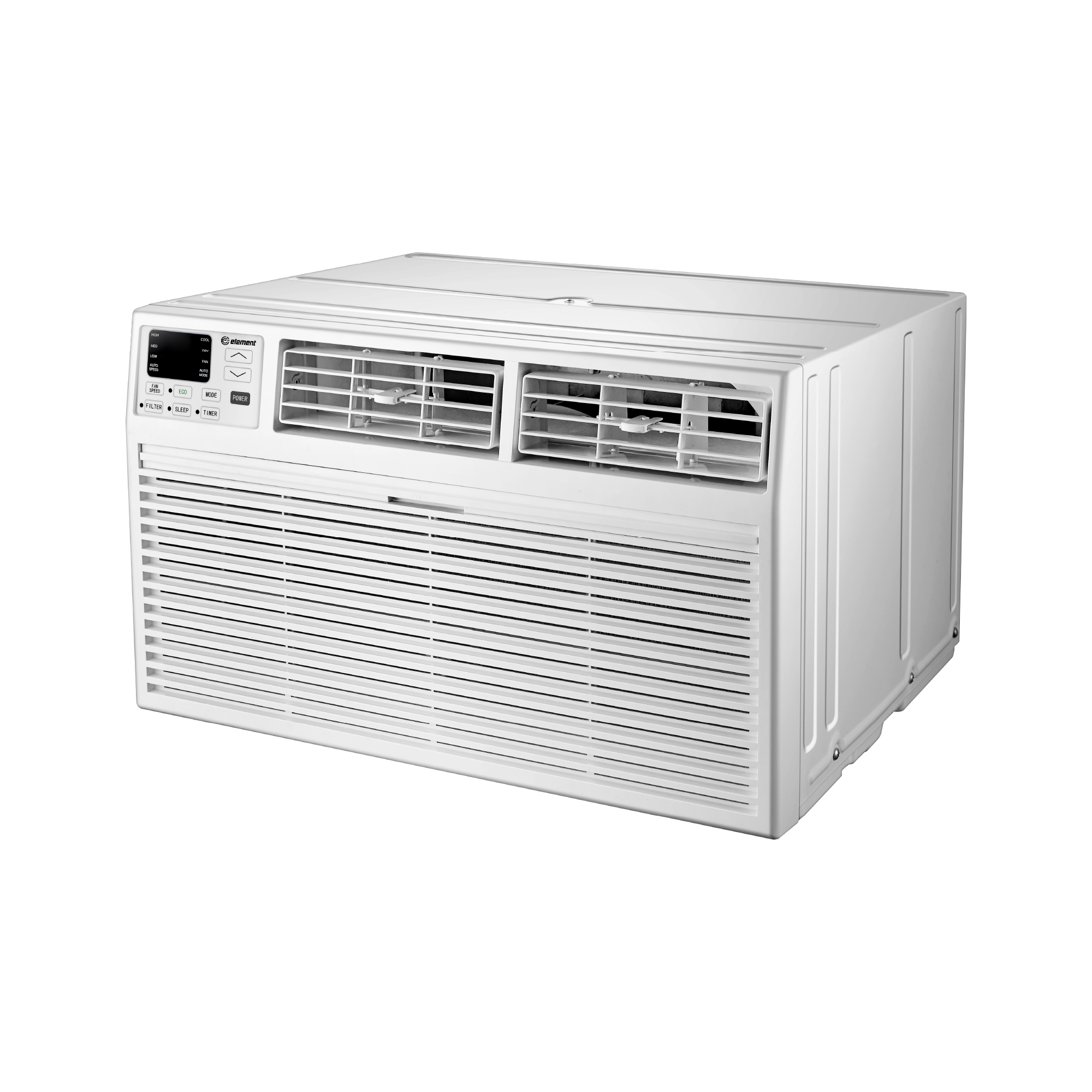 Take back your floor space and enjoy permanent cooling comfort. The Element 14,000 BTU Through-the-Wall Air Conditioner cools up to 700 square feet with powerful, reliable performance and installs directly into your wall sleeve. Installation is straightforward with a universal fit design compatible with standard wall sleeves, and the trim kit is included to match your décor. Remote control operation lets you manage temperature and fan speed from anywhere in the room, while Sleep Mode automatically adjusts settings for restful nights. The built-in dehumidifier removes excess moisture, and the washable filter simplifies maintenance. With electronic controls, a programmable 24-hour timer, and energy-saving Eco Mode, the Element 14,000 BTU Through-the-Wall Air Conditioner delivers the permanent cooling solution your home deserves.